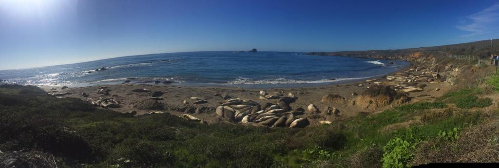 La route défile sous les roues de notre 4×4, direction Big Sur avec un arrêt d’1 heure pour observer les éléphants de mer à San Simeon. Les éléphants de mer passent l’essentiel de leur année en pleine mer mais ils rejoignent leur port d’attache deux fois par an pour donner naissance, se reproduire, muer et se reposer. Piedras Blancas est le lieu idéal pour les observer lors de ces périodes. Nous avons la chance d’assister à ce rassemblement impressionnant que nous observerons depuis le view point.