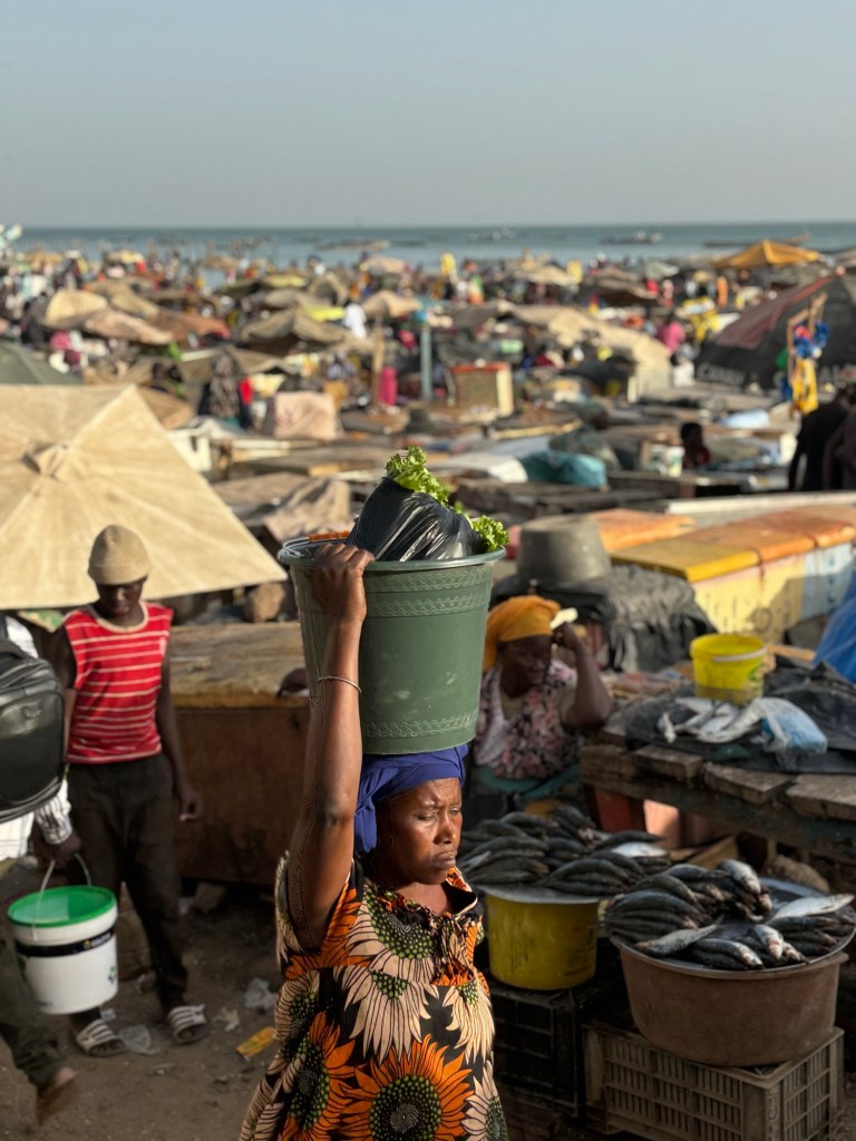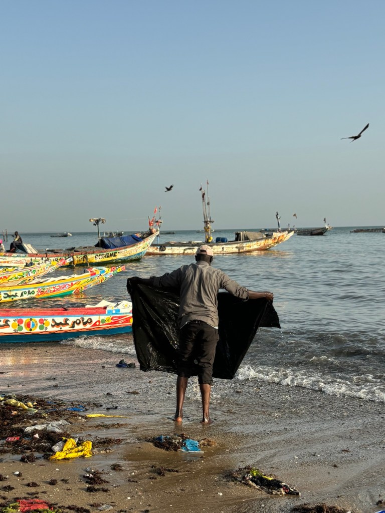 Vers 16h30 cap vers M’bour, deuxième plus gros port de pêche après celui de Dakar. C’est sur le sable que nous assisterons au ballet des pirogues et autres bateaux qui rentrent de leur journée en mer, les filets et les cuves remplis de poissons. Chacun semble avoir une mission bien définie et tout s’organise dans un brouhaha et une effervescence propre aux pays d’Afrique. Les femmes s’attèlent à la découpe à l’étalage et à la vente des poissons et s’ensuit le début des négociations.