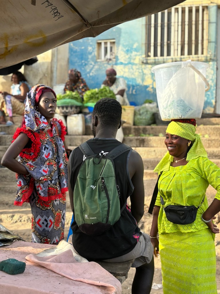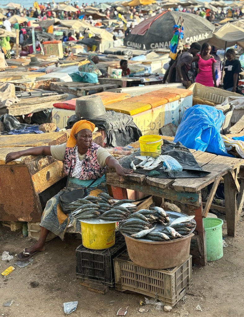 Nous poursuivons notre chemin juste derrière le port en empruntant quelques ruelles qui nous mènent directement au marché local, l’un des plus grands du pays! Un vrai labyrinthe que les locaux empruntent régulièrement pour acheter de beaux tissus en WAX, des fruits, des légumes, des épices et du bric à brac. Evidemment, nous ne repartons pas les mains vide! Quelques mètres de tissus, des épices et un peu de déco reviendrons avec nous dans les valises…
