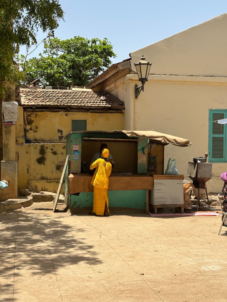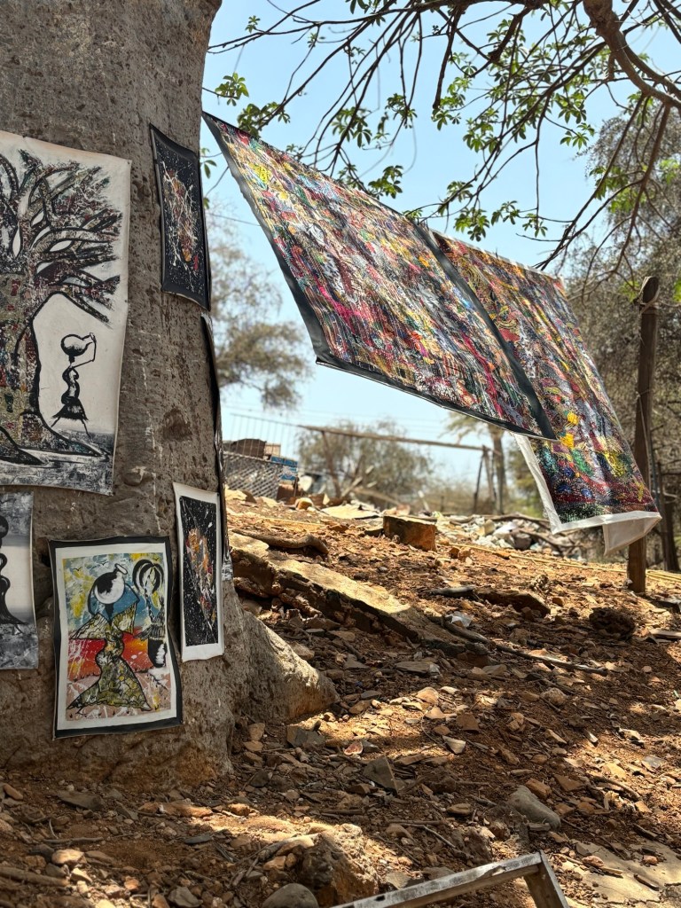 le Lomanart , un petit hôtel de 4 chambres à peine qui abrite une belle galerie d’art, ouvre ses porte à 8:30. Nous commençons la journée en même temps que l’équipe de ménage qui a l’air étonnée de voir des touristes si matinales. La visite est gratuite et nous passerons 1h a découvrir l’univers de Loman, la propriétaire des lieux, une artiste australienne qui a grandit à Capetown en Afrique du Sud et qui est tombée amoureuse du Sénégal en 2007. Ses œuvres, ainsi que celles des expositions ponctuelles, nous entraînent de pièces en pièces jusqu’au Roof top qui offre une vue sympa sur le quartier.