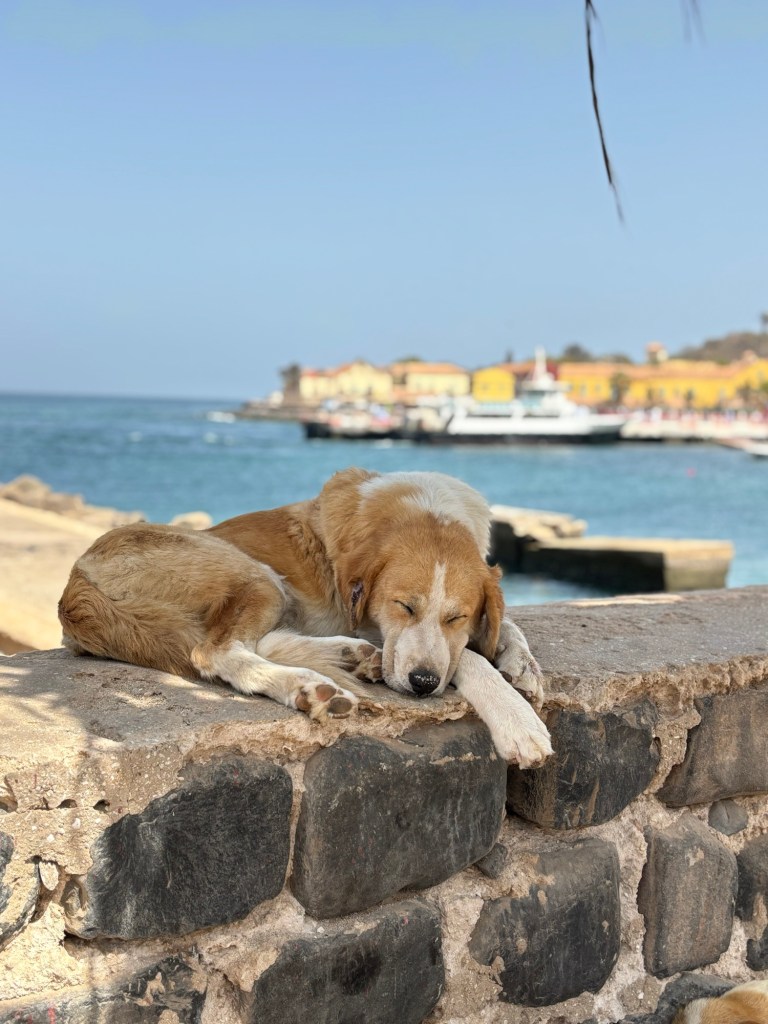Yoro nous rejoint ensuite pour une visite guidée de cette île qu’il connait sur le bout des doigts. A travers les 24 ruelles constituant un véritable labyrinthe, nous nous laissons attirer par quelques ateliers d’arts et des fresques de street art rendant hommage à certaines célébrités qui ont à un moment donné de leur carrière œuvré en faveur du peuple africain. Nous passons bien sûr par la maison de France Gall qui a passé une bonne partie de sa vie sur l’île, et nous assistons par hasard à l’entrainement matinal des militaires. Nous finirons la matinée en observant les pêcheurs depuis la falaise.