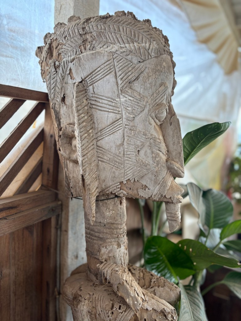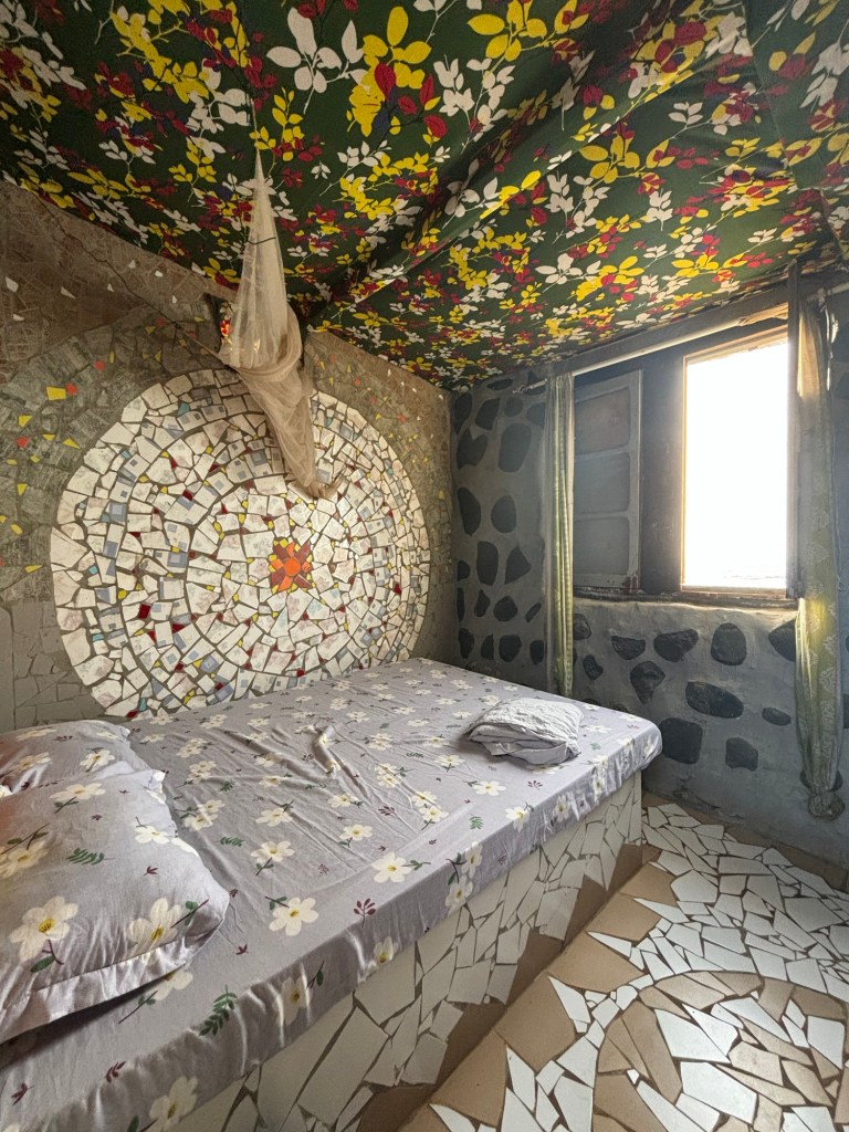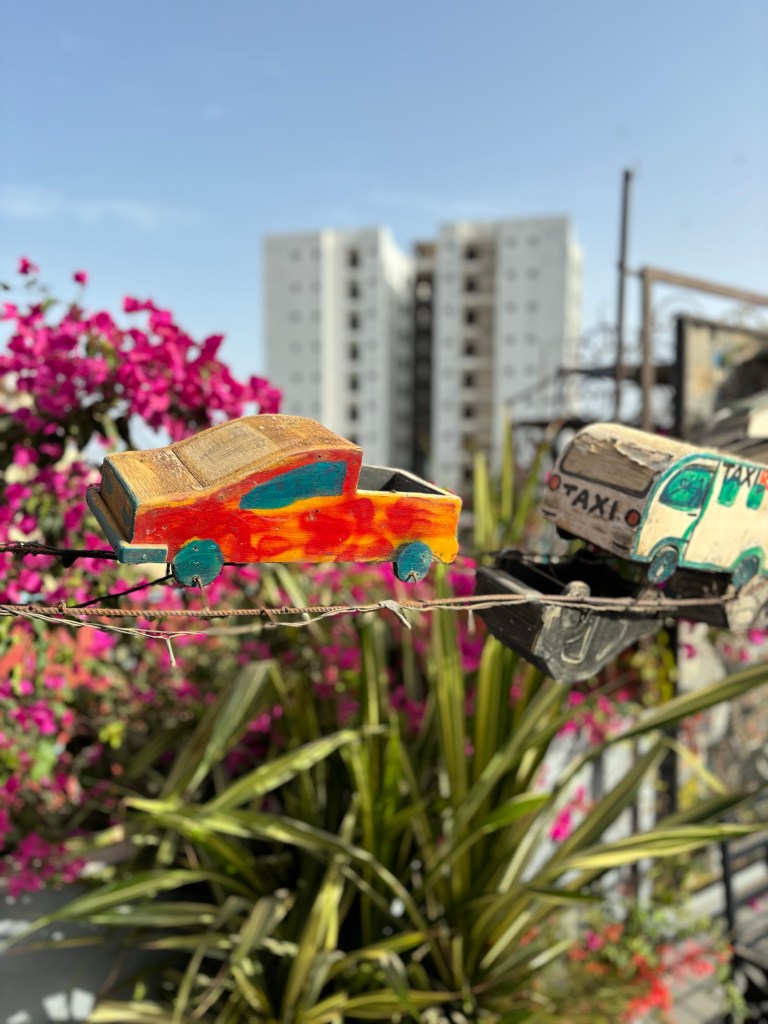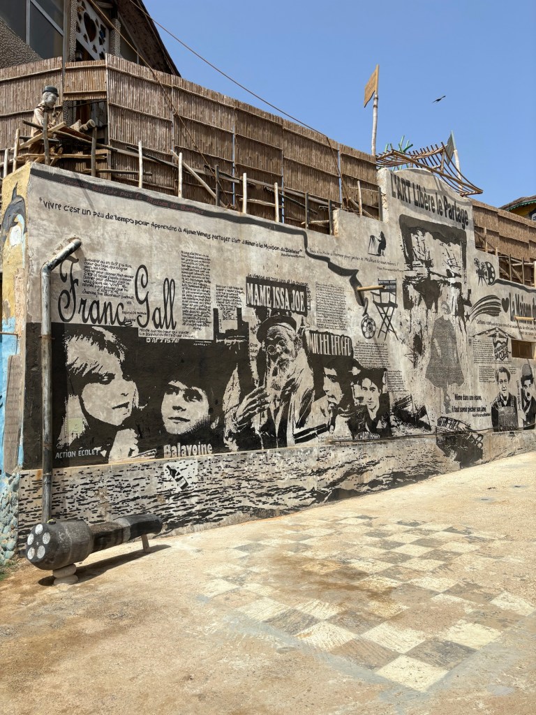 Ce matin nous déjeunons à la maison du bonheur . Unique en son genre, ce lieu magique a été créé par Bertrand Jeanne en hommage à l’Abbé Pierre, 13 ans après sa mort. Tous les fonds sont reversés à l’association NAP (Nouvel âge du partage) au profit des enfants défavorisés de Dakar . Le complexe accueille à la fois une école d’art, deux restaurants et 7 chambres d’hôtes dont la déco est entièrement dédiée à des artistes. Nous profitons du calme des lieux pour déguster un petit café accompagné de crêpes maison, le tout avec une vue sur la superbe piscine.