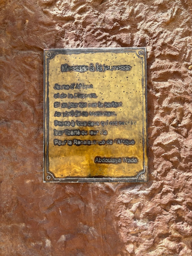Nous grimperons ensuite les nombreuses marches qui nous mènent au quelque peu controversé Monument de la Renaissance Africaine, inauguré en avril 2010 pour commémorer le cinquantième anniversaire de la décolonisation du Sénégal. Façonnée en bronze sur 50m de haut, elle représente un homme torse nu tenant par la main droite une femme et portant de la gauche un enfant. Tous 3 regardent à l’horizon, oubliant le passé et attendant les promesses d’un avenir meilleur pour le peuple africain.